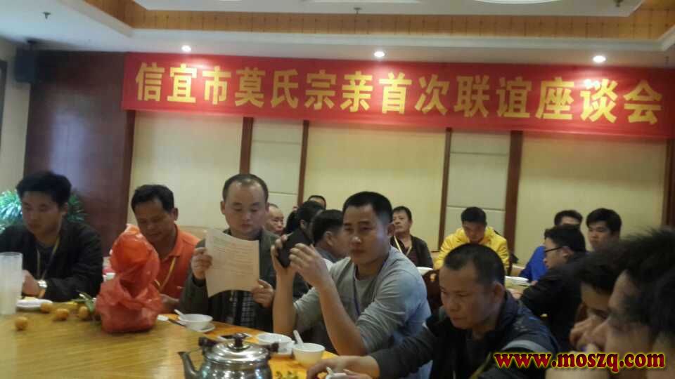2015年2月21日信宜市莫氏宗亲联谊首次座谈会,好多谢莫经山先生,莫毅华先生,莫光华先生,莫水祥先生,莫海金先生,莫南山先生和罗定各位兄弟到信宜指导参加交流,这是信宜市莫氏兄弟第一次聚会,兄弟们都很热情参加,虽然有很多地方做得不够好,但兄弟在一起都很开心地畅谈交流,希望以后的聚会会做得更好,也希望信宜能尽早成立“信宜市莫氏宗亲联谊会”,信宜欢迎所有莫家兄弟到信宜交流莫家文化,莫家团结精神,共建莫家兴旺。